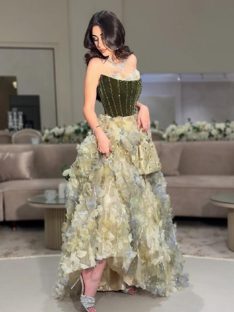 الفستان طويل بلون بنفسجي ملكي، مصمم بقصة ضيقة من الأعلى مع تفاصيل لامعة وزخارف مطرزة تنسدل على طول القماش. الأكتاف مكشوفة مع أكمام شفافة منفصلة تضيف لمسة أنثوية أنيقة. مناسب للمناسبات الفاخرة والإطلالات المسائية