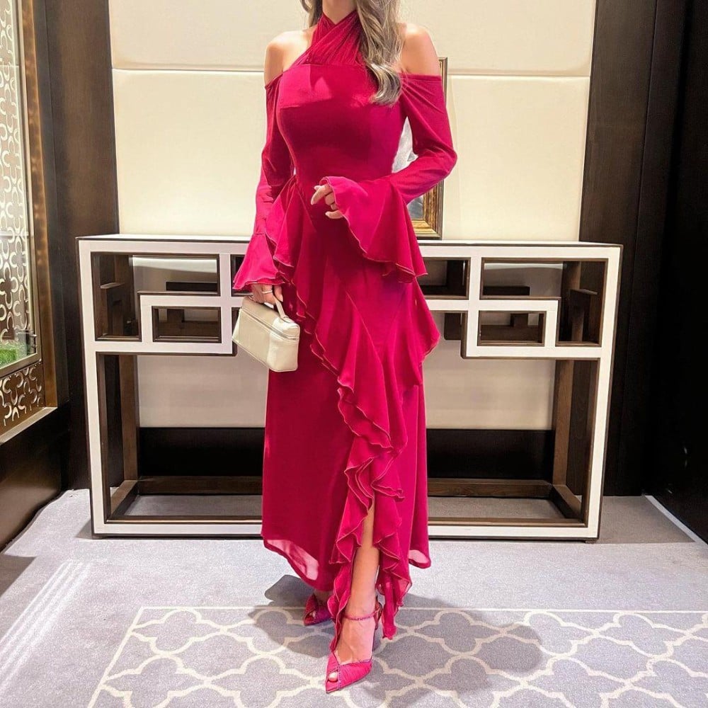 - يتميز بقصة كلوش الأنيقة التي تضفي حركة وأناقة على الفستان.