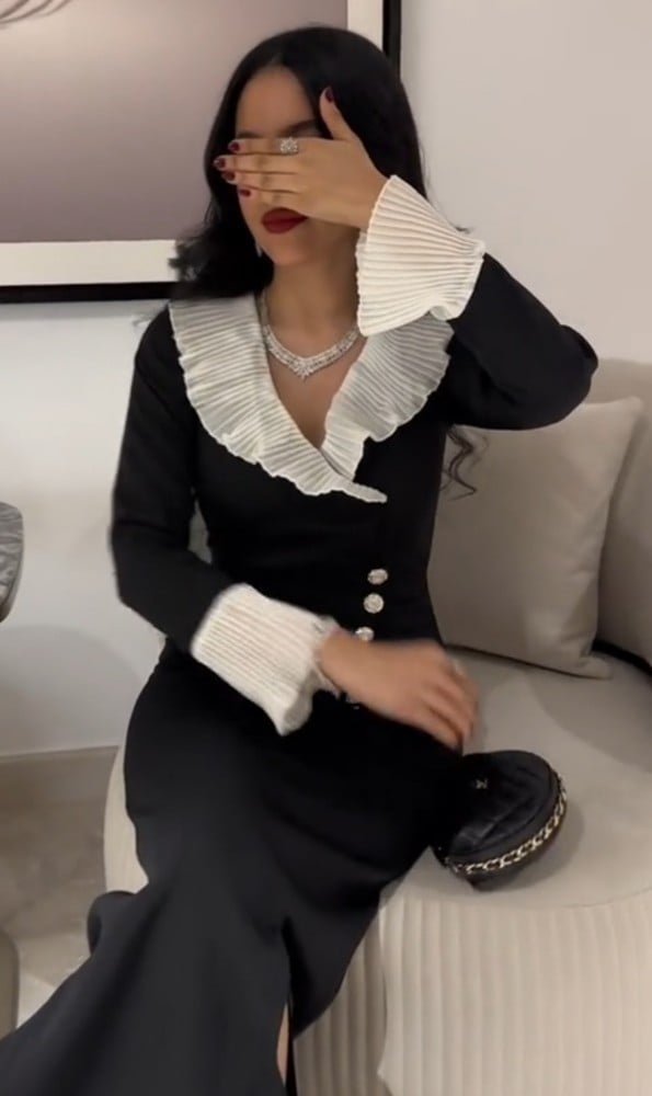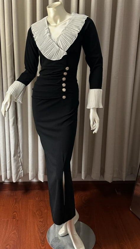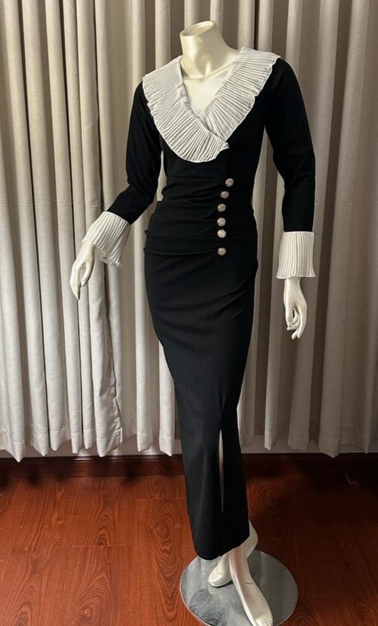 ستريتش الخامه يتميز بفتحه وعليها ازارا زادته اناقه وجمالا والبلاسيه الأبيض زاد التصميم انوثه الخامه قابله للغسيل والكي