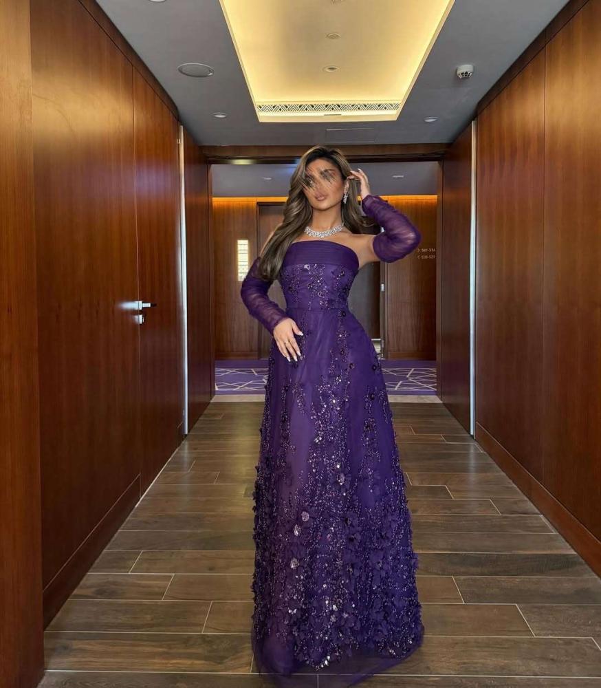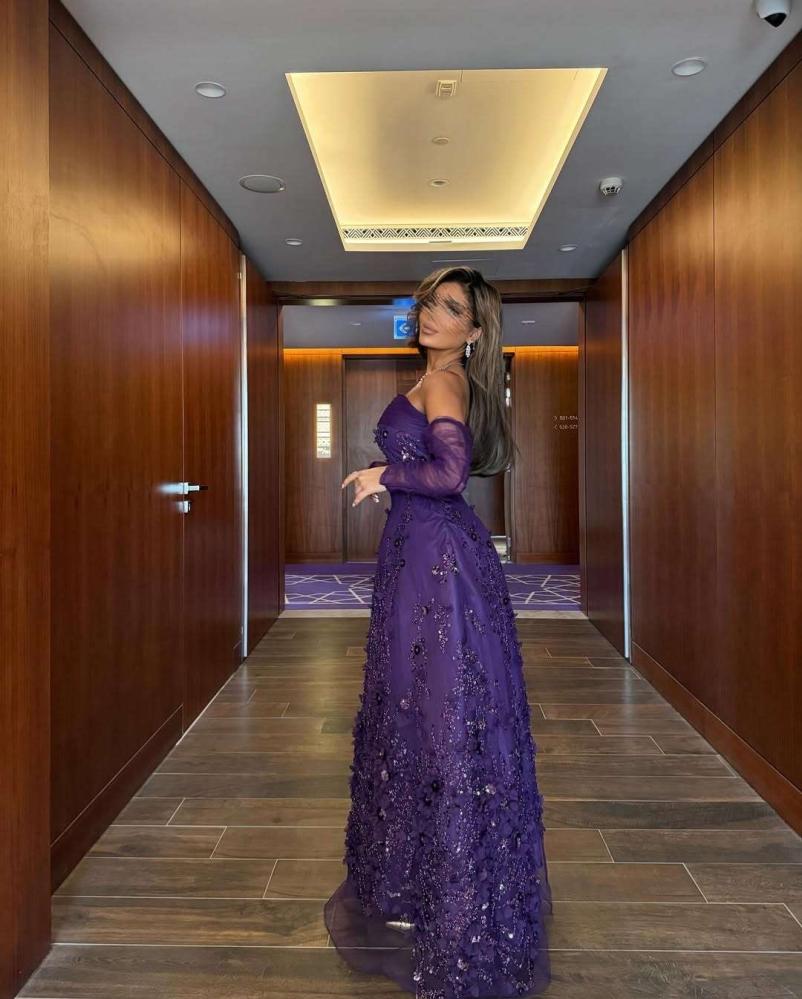 الفستان طويل بلون بنفسجي ملكي، مصمم بقصة ضيقة من الأعلى مع تفاصيل لامعة وزخارف مطرزة تنسدل على طول القماش. الأكتاف مكشوفة مع أكمام شفافة منفصلة تضيف لمسة أنثوية أنيقة. مناسب للمناسبات الفاخرة والإطلالات المسائية