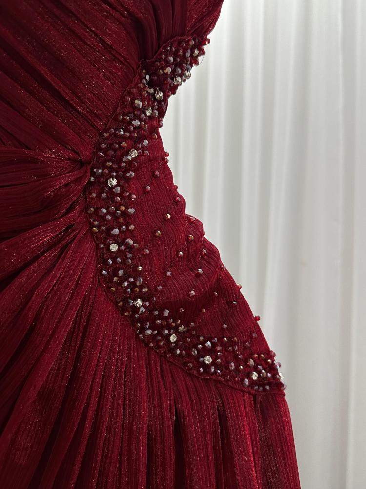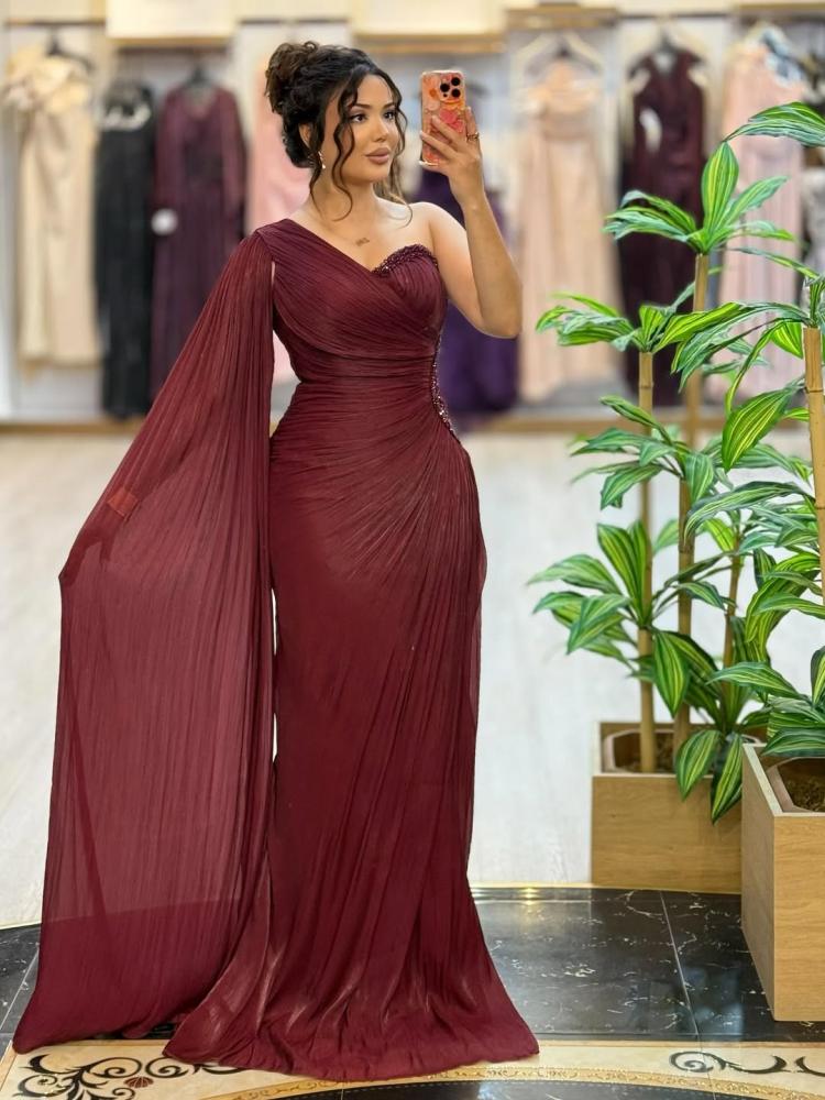 الفستان طويل بلون بنفسجي ملكي، مصمم بقصة ضيقة من الأعلى مع تفاصيل لامعة وزخارف مطرزة تنسدل على طول القماش. الأكتاف مكشوفة مع أكمام شفافة منفصلة تضيف لمسة أنثوية أنيقة. مناسب للمناسبات الفاخرة والإطلالات المسائية