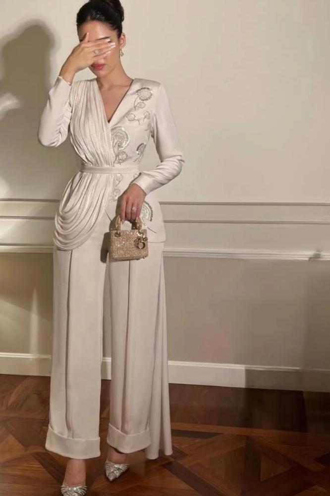 فستان سهرة أسود أنيق مصمم بقصّة كورسيه علوية شفافة مرصعة بحبيبات لامعة تضيف لمسة ساحرة من البريق والأنوثة. يأتي الفستان بقصة ضيقة تُبرز جمال القوام، وينسدل بانسيابية مع تطريز فاخر وخطوط متموجة تضفي بُعداً جمالياً ملفتاً. الشق الجانبي العالي يضيف جرأة راقية وأناقة ساحرة، بينما الحذاء البيج ذو الكعب العالي يُكمل الإطلالة بلمسة أنثوية ناعمة. الشعر المموج المنسدل يعزز من جمالية الإطلالة ويضفي طابعاً هوليوديّاً ساحراً.